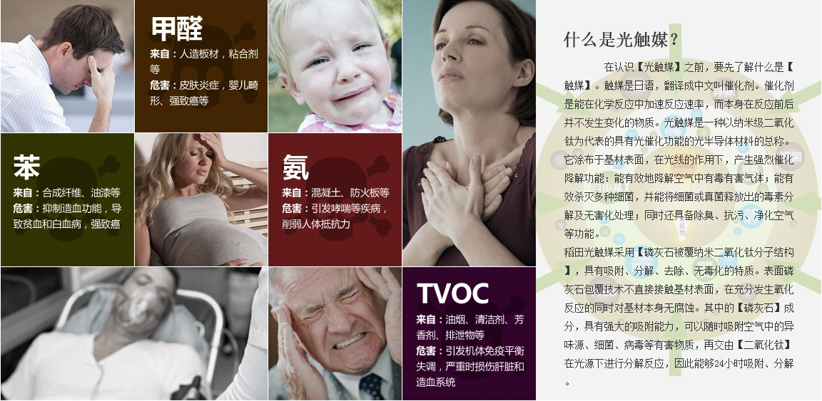 在認(rèn)識【光觸媒】之前,要先了解什么是【觸媒】。觸媒是日語,翻譯成中文叫催化劑。催化劑是能在化學(xué)反應(yīng)中加速反應(yīng)速率,而本身在反應(yīng)前后并不發(fā)生變化的物質(zhì)。光觸媒是一種以納米級二氧化鈦為代表的具有光催化功能的光半導(dǎo)體材料的總稱。它涂布于基材表面,在光線的作用下,產(chǎn)生強(qiáng)烈催化降解功能:能有效地降解空氣中有毒有害氣體;能有效殺滅多種細(xì)菌,并能將細(xì)菌或真菌釋放出的毒素分解及無害化處理;同時還具備除臭、抗污、凈化空氣等功能。 稻田光觸媒采用【磷灰石被覆納米二氧化鈦分子結(jié)構(gòu)】,具有吸附、分解、去除、無毒化的特質(zhì)。表面磷灰石包覆技術(shù)不直接接觸基材表面,在充分發(fā)生氧化反應(yīng)的同時對基材本身無腐蝕。其中的【磷灰石】成分,具有強(qiáng)大的吸附能力,可以隨時吸附空氣中的異味源、細(xì)菌、病毒等有害物質(zhì),再交由【二氧化鈦】在光源下進(jìn)行分解反應(yīng),因此能夠24小時吸附、分解